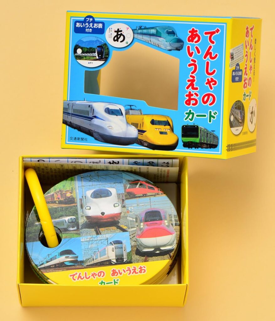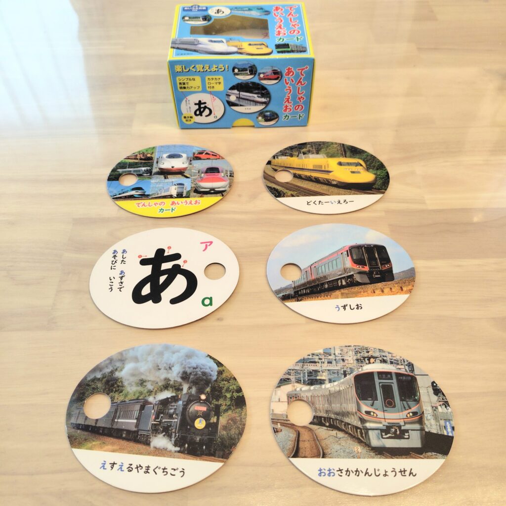 何かよい方法がないか、書店の幼児向け教材コーナーを探したところ、「でんしゃのあいうえおカード」を発見しました。これが、乗り物大好きな下の子にぴったりとはまりました。