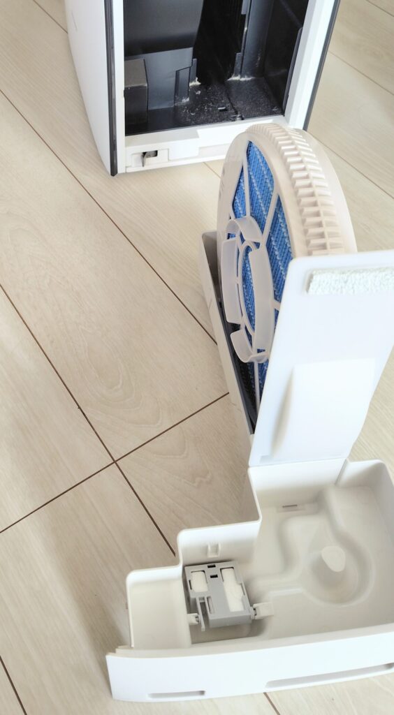 前回加湿機能を使ったのは春。ひと月ほど使ってお手入れをし、それっきり。半年ぶりに開けるので、ちょっとどきどきしました。給水タンクを取り出し、さらにその下のフィルター部分を取り出すと…
