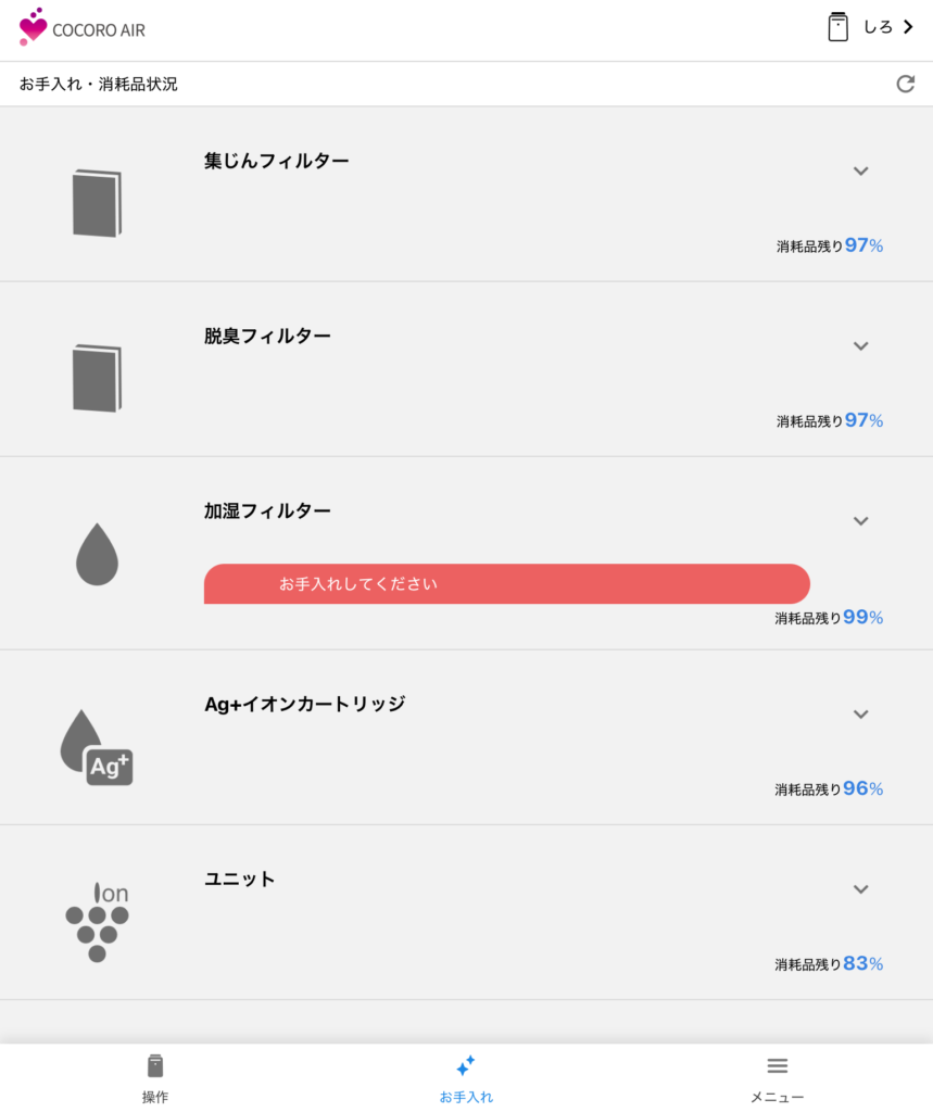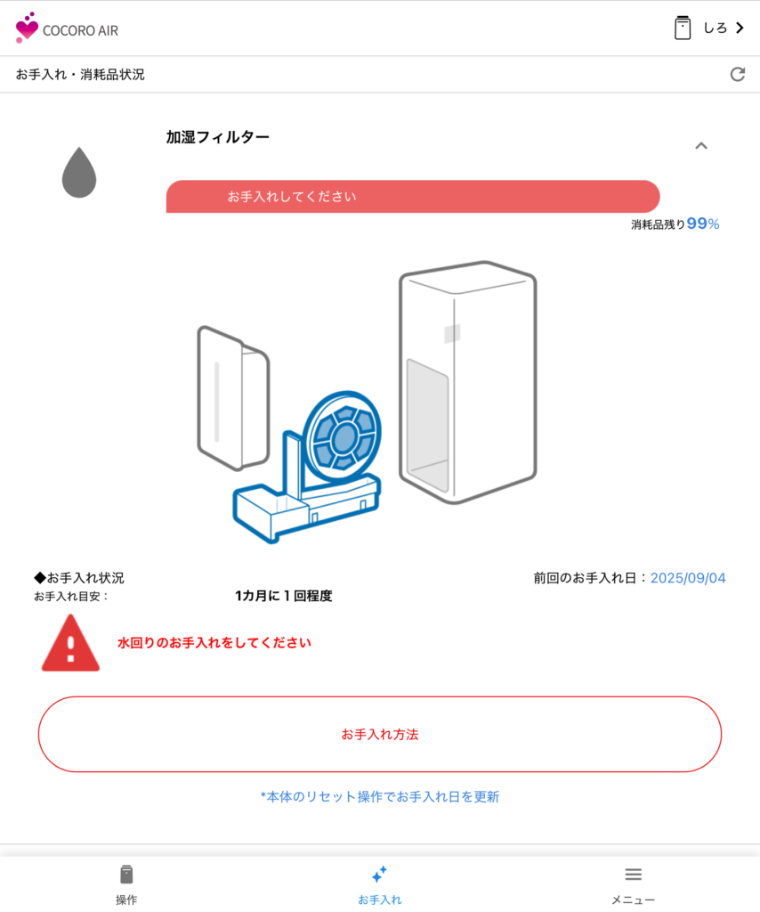 タンクに給水しながら使用してしばらくすると、お手入れランプが点灯しました。アプリを見てみると、加湿フィルターのところに「お手入れしてください」の文字が…!